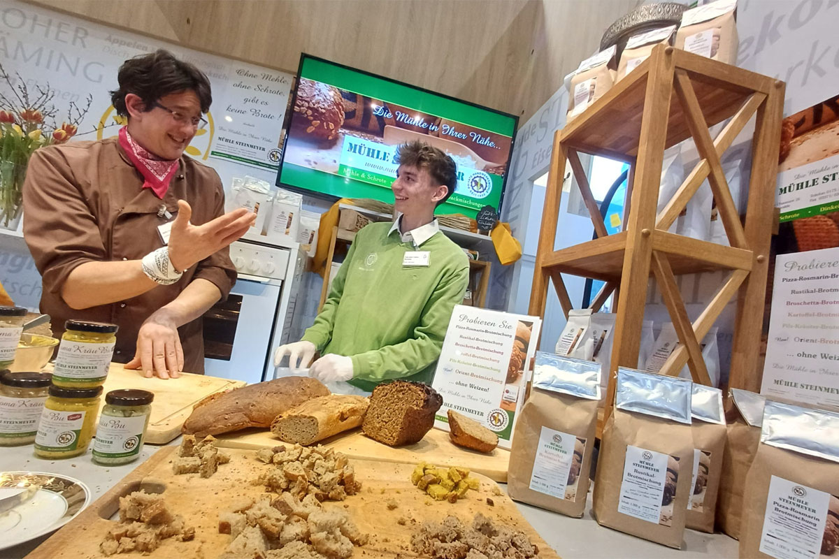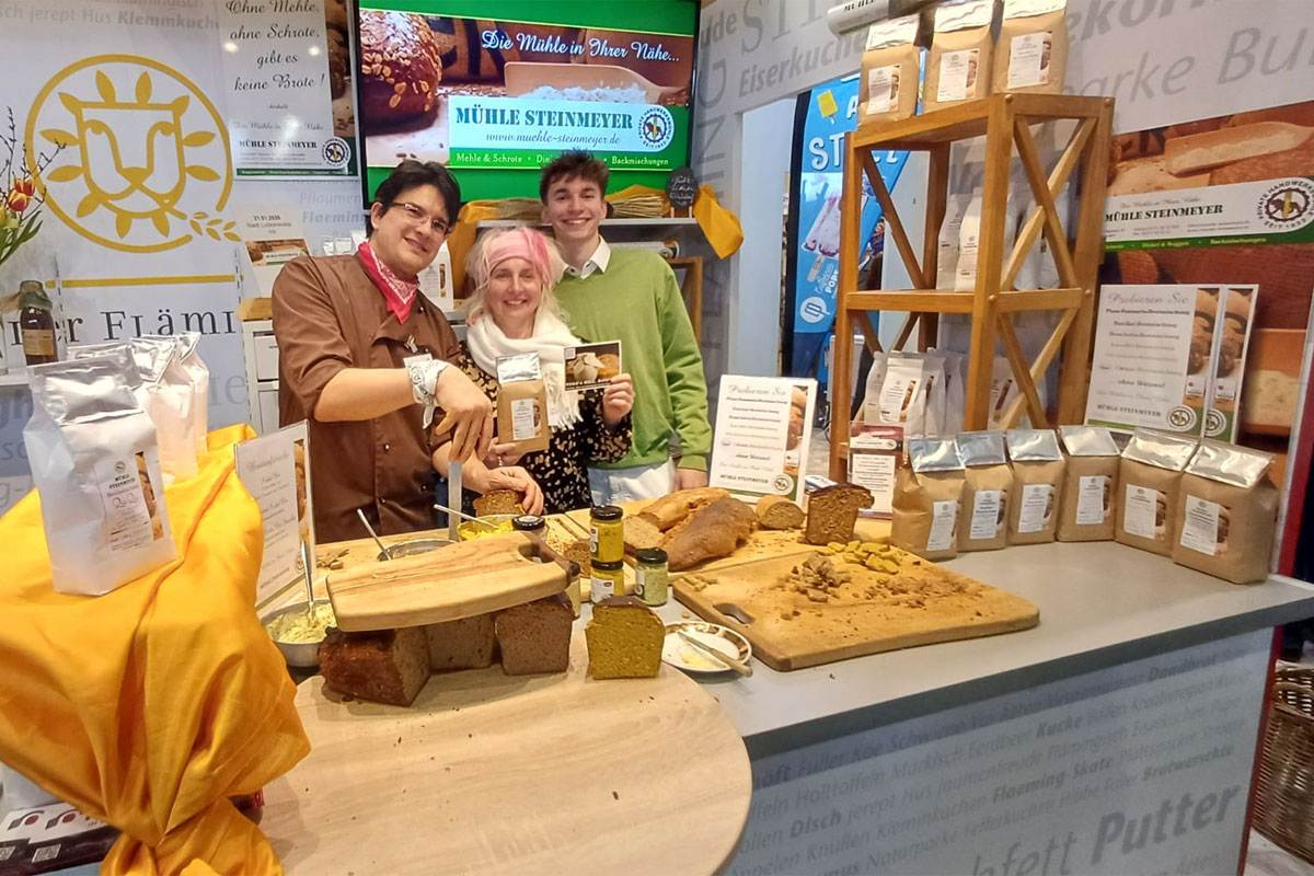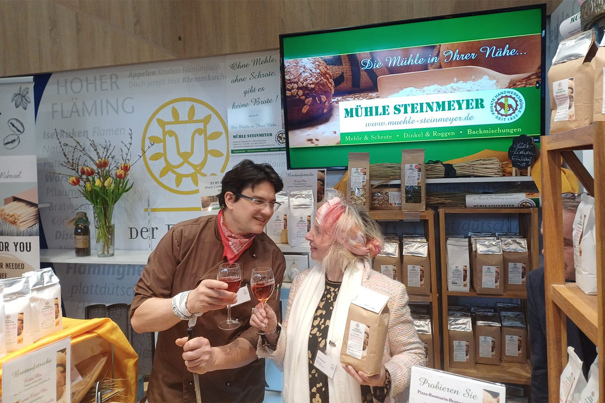 Auch in diesem Jahr präsentierten wir uns gemeinsam mit der Stadt Luckenwalde am Stand des Landkreises Teltow-Fläming. Wir fühlten uns uns wieder sehr wohl an diesem tollen Standort. Dank der Nähe zum Kochstudio konnten wir uns wunderbar mit Olaf Kosert, dem Brandenburger TV-Koch, verbinden. Im neuen Kochbuch "So schmeckt Brandenburg" gibt es auch das Rezept Gelbweizen-Parmesan-Feta-Streusel zum Nachkochen. Außerdem feierten wir die 10-jährige Verknüpfung mit dem Thurmann-Feinkost-Team.